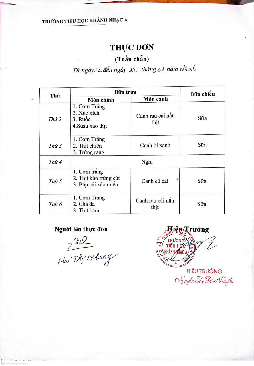 Thực đơn bán trú từ ngày 16 đến 20 tháng 3 năm 2026