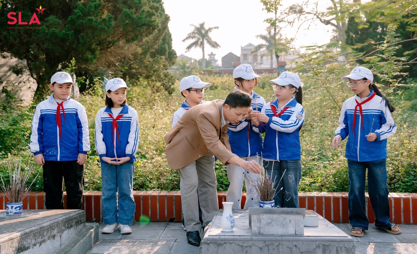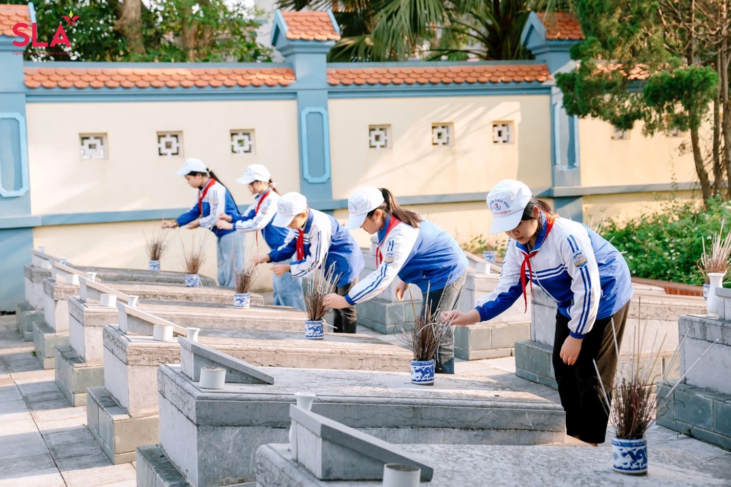 Sau lễ dâng hương chung, các thầy cô giáo, cán bộ Trung tâm SLA và các em học sinh đã tới thắp hương tại từng phần mộ liệt sĩ. Mỗi nén tâm hương được thắp lên là một lời tri ân thầm lặng, là sự nhắc nhở sâu sắc về những hy sinh lớn lao của các anh hùng liệt sĩ trong các cuộc kháng chiến bảo vệ Tổ quốc. Các em học sinh với đôi tay còn nhỏ bé nhưng đầy trân trọng đã cẩn thận lau dọn từng ngôi mộ, đặt những nén hương thơm lên bia mộ với lòng biết ơn đầy thành kính.