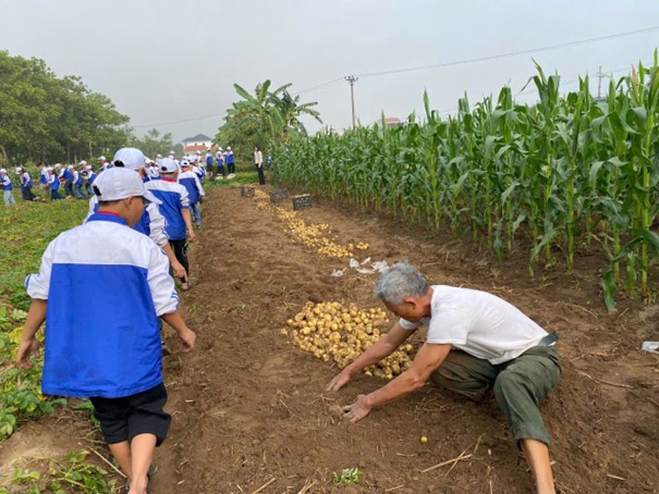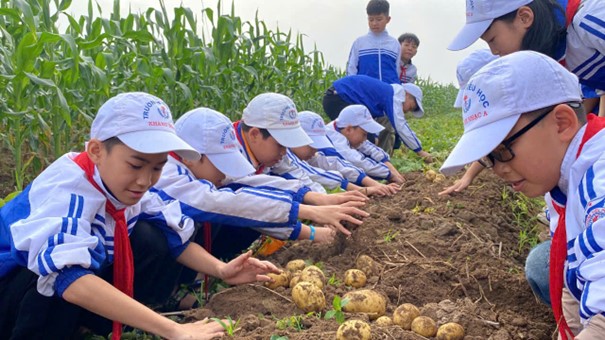 Rời xưởng may, các em đến với vườn cây ăn quả, đến với cánh đồng khoai tây và hào hứng trải nghiệm bới khoai. Từng củ khoai được nhặt lên từ lòng đất không chỉ mang lại niềm vui giản dị, mà còn giúp các em cảm nhận rõ hơn sự vất vả, cần cù của người nông dân, từ đó hình thành thái độ biết ơn và yêu quý lao động chân chính.
