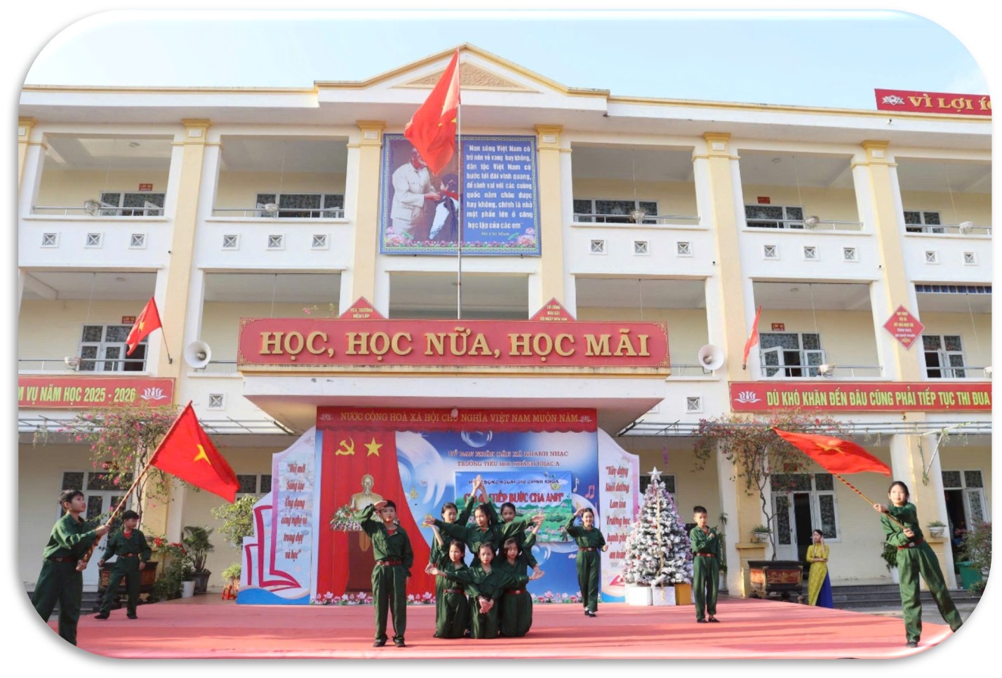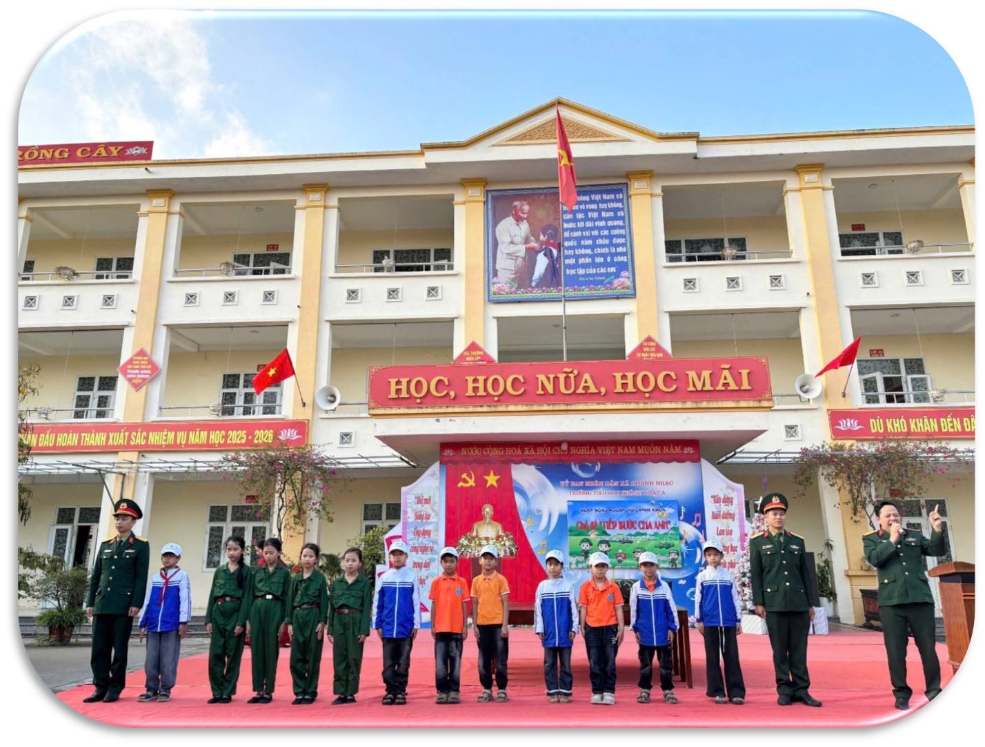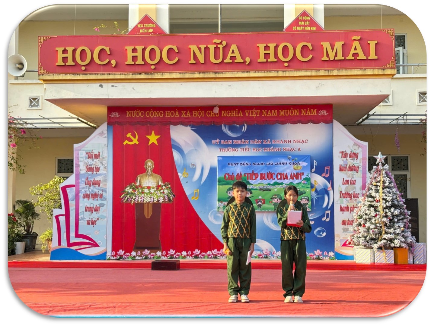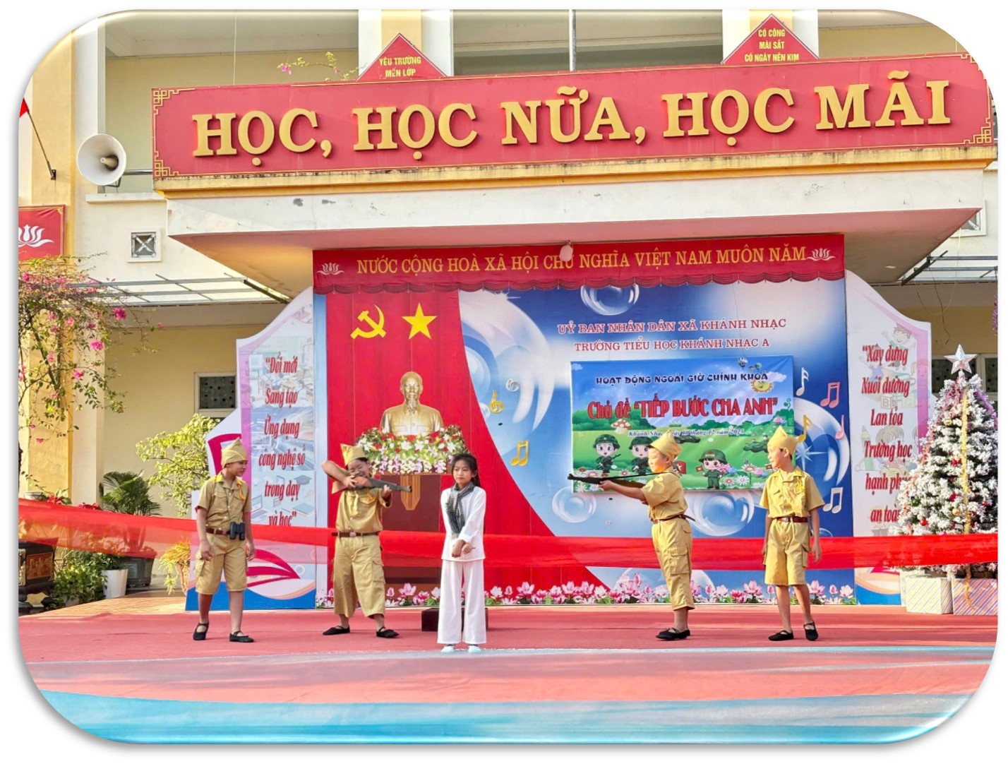 Trong không khí sôi nổi của toàn Đảng, toàn dân và toàn quân hướng tới kỷ niệm Ngày thành lập Quân đội Nhân dân Việt Nam, Ngày hội Quốc phòng toàn dân 22/12, chiều ngày 19 tháng 12 năm 2025, Trường Tiểu học Khánh Nhạc A đã tổ chức chương trình ngoại khóa với chủ đề “Tiếp bước cha anh”. Đây là hoạt động giáo dục ý nghĩa, góp phần bồi dưỡng cho học sinh lòng yêu nước, niềm tự hào dân tộc, ý thức biết ơn sâu sắc đối với các thế hệ cha anh đã anh dũng hy sinh vì độc lập, tự do của Tổ quốc.